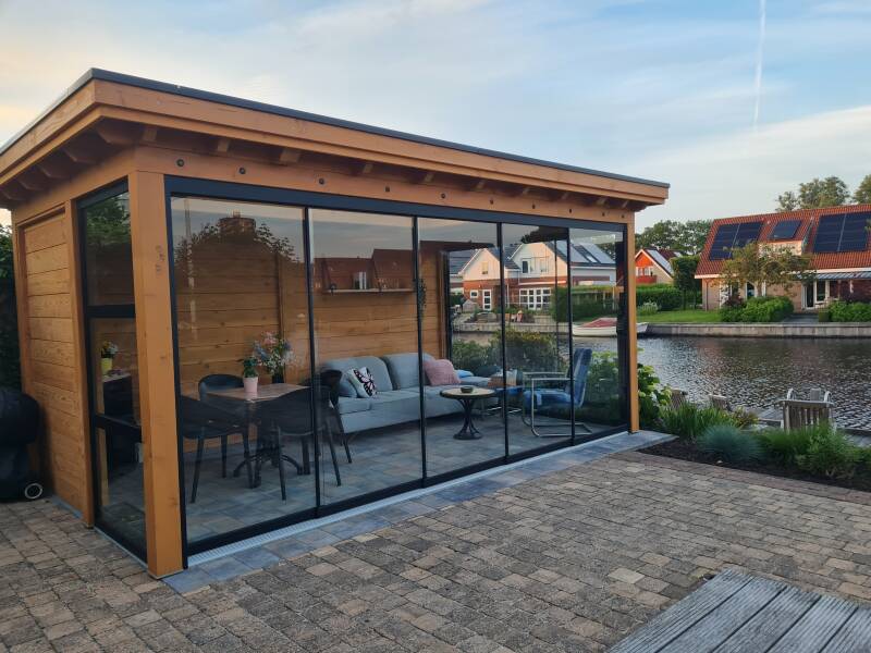 Glazen schuifwanden in een houten overkapping